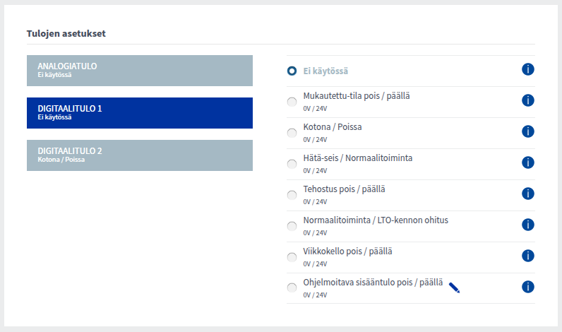 Ilmanvaihtokoneessa on kaksi digitaalituloa (Digitaalitulo 1 ja Digitaalitulo 2). Voit valita ohjelmoitavan sisääntulon aktivoitumaan kummastakin digitaalitulosta, mutta käytettävissä on vain yksi ohjelmoitava sisääntuloprofiili, joten asetukset ovat samat molemmille.