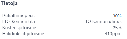 - Puhallinnopeus — Ilmaisee puhaltimen nopeuden. Jos ilmanvaihtokoneessa on jokin automaattinen puhallinnopeuden tehostus käytössä, asetettu arvo näkyy suluissa ja sen jälkeen näytetään todellinen puhaltimen nopeus.
