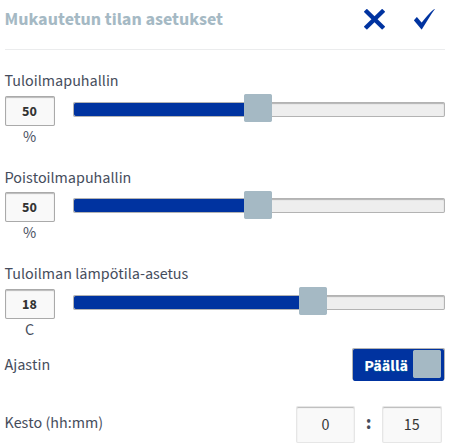 - Aseta Mukautettu-tilan tuloilmapuhaltimen teho prosentteina enimmäistehosta siirtämällä