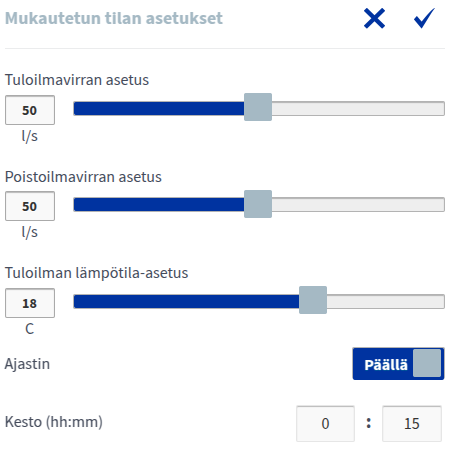 - Tuloilmavirran asetus — Aseta ilmanvaihdon voimakkuus (l/s tai m3/h). Jos tarvitset Mukautettu-tilassa lyhytaikaista ylipainetta esimerkiksi takan sytyttämisen tai liesituulettimen käytön ajaksi, suosittelemme nostamaan tuloilman ilmavirtaa. Poistoilman ilmavirran pienentämistä ei suositella.