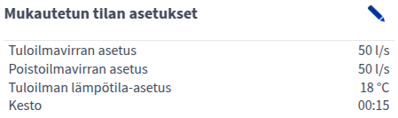 - Poistoilmavirran asetus — Aseta ilmanvaihdon voimakkuus (l/s tai m3/h). Huomautus:Poiketen muista ilmanvaihdon tiloista Mukautettu-tilassa automaattiset tehostustoiminnot (kosteus, hiilidioksidi ja viilennys) tai jäätymisen esto eivät ole käytössä. Mukautettu-tilaa tulisi käyttää vain lyhytaikaiseen ilmanvaihdon tasapainottamiseen esimerkiksi takan tai liesituulettimen käytön aikana.