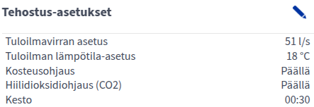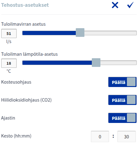 - Tuloilmavirran asetus — Aseta ilmanvaihdon tehostettu tuloilmavirta (l/s tai m³/h). Tehostus-tilaa käytetään tilanteissa, joissa tarvitaan hetkellisesti lisää ilmanvaihtoa, esimerkiksi suihkun, ruoanlaiton tai suuremman henkilömäärän aiheuttaman ilmanvaihdon tarpeen vuoksi. Tuloilmavirran asetus ei voi olla pienempi kuin Kotona-tilassa.