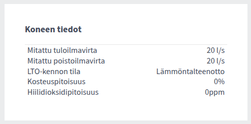 - Tuloilmavirran asetus — Näyttää ilmanvaihtokoneelle asetetun tuloilmavirta-asetuksen (l/s tai m3/h). Jos automaattinen tehostus (esim. kosteus- tai hiilidioksidiohjaus) on käytössä, todellinen ilmavirta voi poiketa asetetusta. Todellinen tuloilmavirta ja poistoilmavirta näkyvät erikseen Tietoja-alueella.