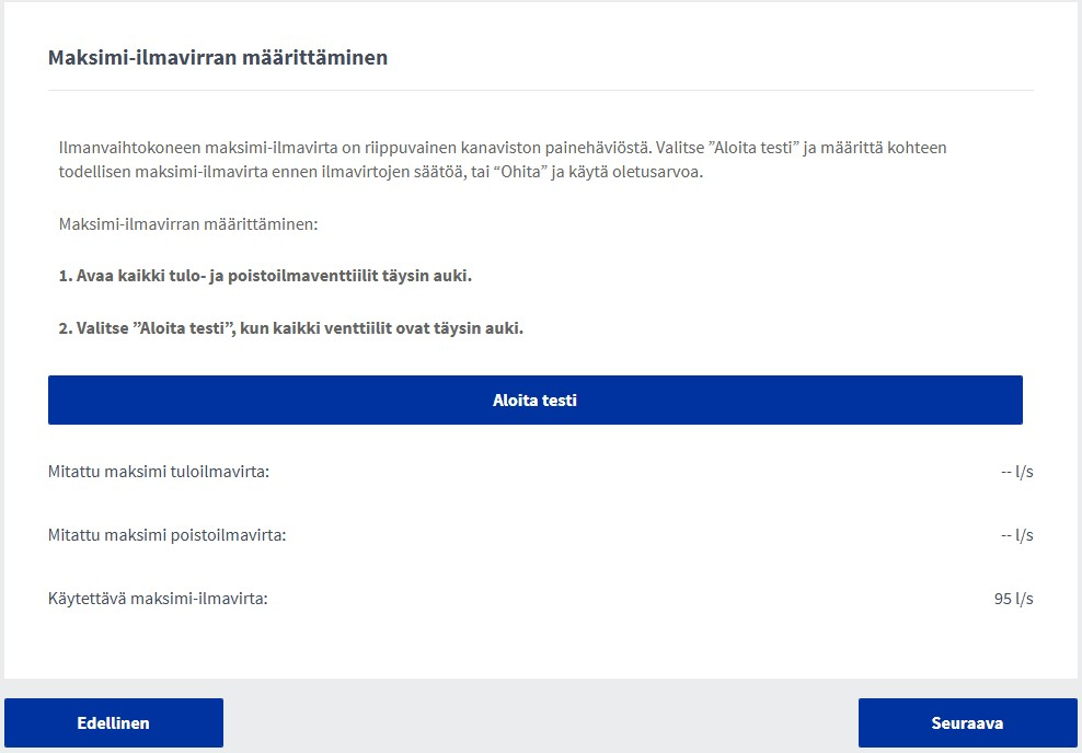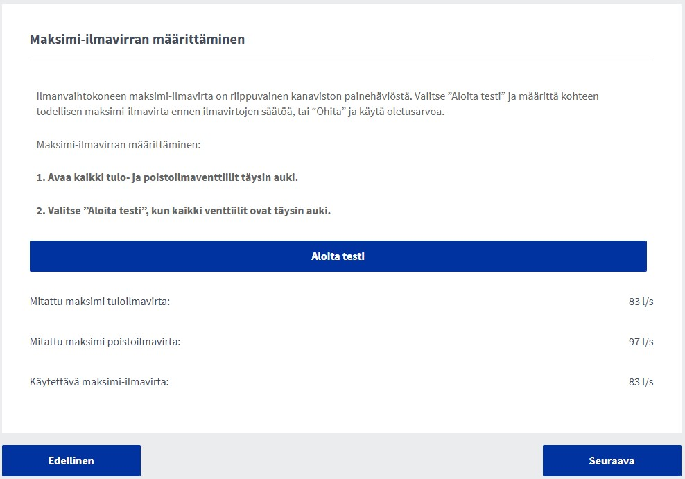 Ensin määritetään koneen maksimi-ilmavirta. Tämä testi on valinnainen, ja se kestää noin 1 minuutin. Testin aikana kaikki tulo- ja poistoilmaventtilit tulee säätää täysin auki.