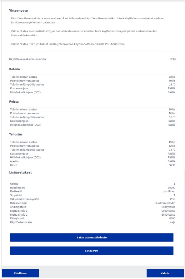 Valitsemalla Lataa asennustiedosto voit luoda asennustiedoston tästä käyttöönotosta ja kopioida asetukset muihin ilmanvaihtokoneisiin.