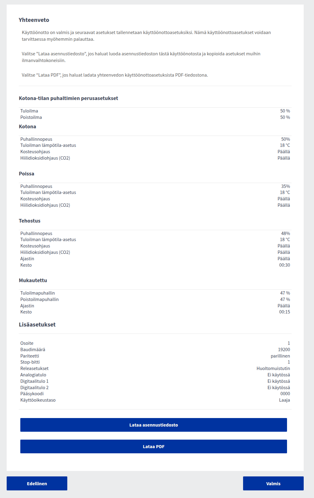 Valitsemalla Lataa asennustiedosto voit luoda asennustiedoston tästä käyttöönotosta ja kopioida asetukset muihin ilmanvaihtokoneisiin.
