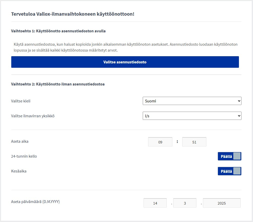 Voit ottaa Vallox-ilmanvaihtokoneen käyttöön kahdella eri tavalla: Käyttöönotto asennustiedoston avulla tai käyttöönotto ilman asennustiedostoa. Käytä asennustiedostoa, kun haluat kopoioida jonkin aikaisemman käyttöönoton asetukset. Asennustiedosto luodaan käyttöönoton lopussa ja se sisältää kaikki käyttöönotossa määritetyt arvot.