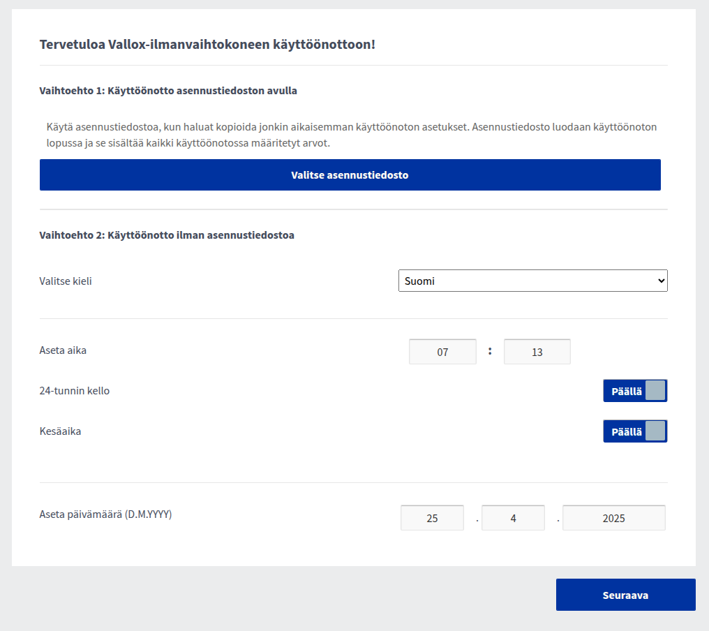 Tervetuloa Vallox-ilmanvaihtokoneen käyttöönottoon!
