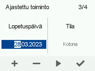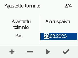 Ajastetun toiminnon alku- ja loppupäivän asettaminen Valitse Asetukset: Valitse Ajastettu toiminto: Aseta ajastetun toiminnon alkamispäivä: Aseta ajastetun toiminnon loppumispäivä:
