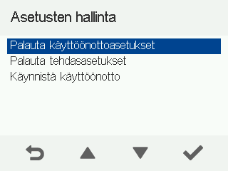 - Palauta käyttöönottoasetukset — Palauttaa käyttöönoton yhteydessä määritetyt asetukset ilmanvaihtokoneeseen.