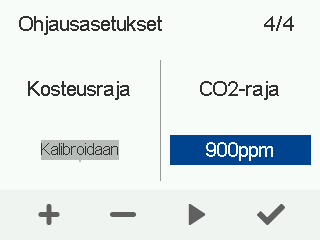 7. Valitse hiilidioksidiraja miljoonasosissa (ppm = parts per million = miljoonasosat) Plus- ja Miinus -painikkeilla. Voit asettaa rajan välille 500–2000 ppm. Tehdasasetus on 900 ppm.