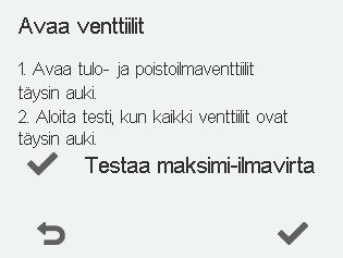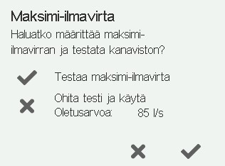 Voit halutessasi määrittää koneen maksimi-ilmavirran käytössä olevalla kanavistolla. Testin kesto on maksimissaan 1 minuutti. Testi ei ole pakollinen, joten sen voi ohittaa valitsemalla Hylkää: . Jos testiä ei suoriteta, maksimi-ilmavirralle käytetään oletusarvoa.