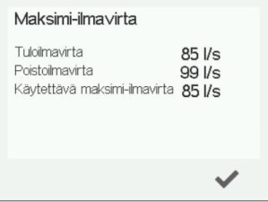 Jos kone ilmoittaa matalasta maksimi-ilmavirrasta, tulo- tai poistoilmavirrassa saattaa olla esim. tukos. Tässä tapauksessa tarkista ilmanvaihtokone ja kanavisto.
