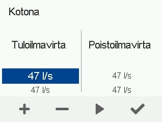 - Aseta Kotona-tilan tulo- ja poistoilmavirrat, ja säädä venttiilit ilmanvaihtosuunnitelman mukaisesti.