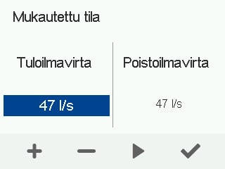 Mukautettu-tilaa käytetään erityistilanteisiin, kuten lyhytaikaiseen takan tai liesituulettimen aiheuttaman alipaineen kompensointiin. Huomioi, että kompensaatiotilanteissa tulo- ja poistoilmavirtojen eron ei suositella olevan yli 30 %.