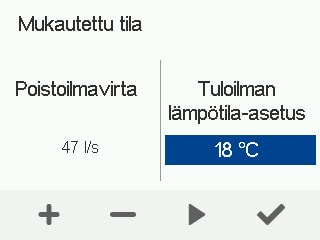 Mukautettu-tilaan voidaan asettaa ajastin, ilmavirrat sekä tuloilman lämpötila.