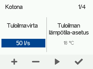- Aseta tuloilmavirta haluamaasi tasoon Plus ja Miinus -painikkeilla. Poistoilmavirta säätyy automaattisesti tuloilmavirran mukaan, eikä sitä tarvitse säätää erikseen.