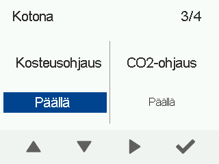 - Valitse nuolipainikkeilla, onko puhallinnopeuden automaattinen säätö ilman hiilidioksidipitoisuuden perusteella käytössä vai ei.