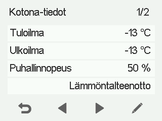 - Tuloilma — Ilmaisee sisätiloihin puhallettavan ilman lämpötilan sekä tuloilman lämpötila-asetuksen (suluissa), jos tuloilma on lämpimämpää kuin sille asetettu arvo.