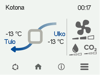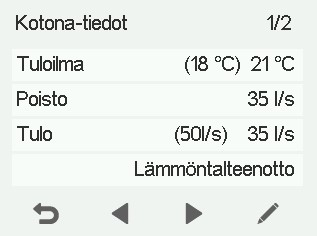 - Tulo — Näyttää tämänhetkisen tuloilman ilmavirran (l/s tai m3/h). Jos ilmanvaihtokone automaattisesti tehostaa ilmavirtaa esimerkiksi kohonneen kosteuden, hiilidioksidin tai viilennystarpeen vuoksi, ilmavirta voi olla suurempi kuin asetusarvo. Tällöin asetettu arvo näkyy suluissa.