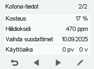 - Hiilidioksidi — Ilmaisee antureiden mittaaman hiilidioksidipitoisuuden.