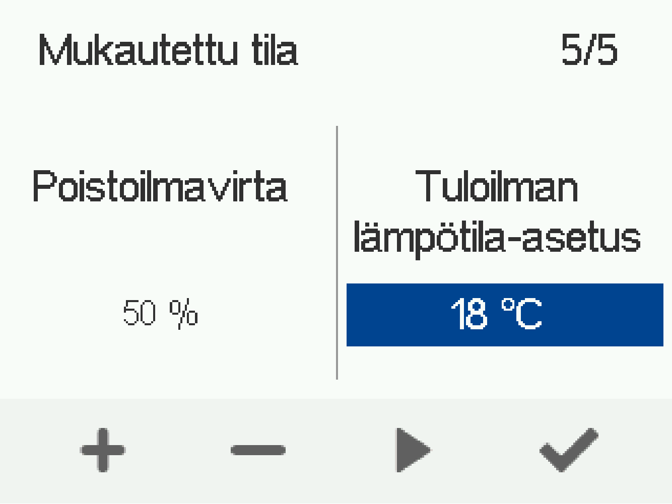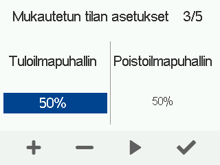 - Aseta Mukautettu-tilan tuloilmapuhaltimen teho prosentteina enimmäistehosta Plus- ja Miinus-painikkeilla.Vihje: