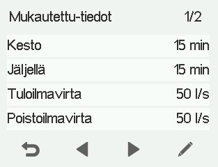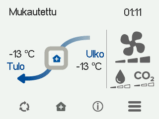 Huomautus:Poiketen muista ilmanvaihdon tiloista Mukautettu-tilassa automaattiset tehostustoiminnot (kosteus, hiilidioksidi ja viilennys) tai jäätymisen esto eivät ole käytössä. Mukautettu -tilaa tulisi käyttää vain lyhytaikaiseen ilmanvaihdon tasapainottamiseen esimerkiksi takan tai liesituulettimen käytön aikana. -