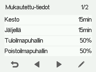 Kesto — Ilmaisee asetetun Mukautettu-tilan keston, kun Mukautettu-tila otetaan käyttöön. Arvo ilmaistaan tunneissa ja minuuteissa.
