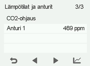 Avautuu näyttö, jossa näkyy hiilidioksidianturien 1-3 mittaama hiilidioksidipitoisuus.