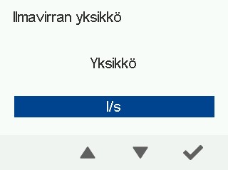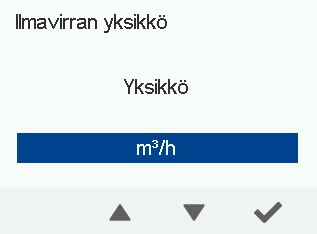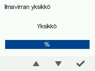 Ilmavirran yksikköValittavat ilmavirran yksiköt ovat: l/s m3/h % Aseta ilmavirran yksikkö. Siirry käyttöönotossa eteenpäin valitsemalla Hyväksy:Mikäli käytät yksikkköä % (puhaltimien nopeuden %-ohjaus), siirry kohtaan Puhaltimien nopeuden %-ohjaus.