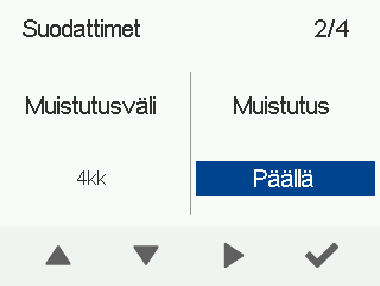 Valitse suodatinmuistutuksen tila:- Päällä - Suodatinmuistutus on käytössä ja kuittaus tapahtuu manuaalisesti.
