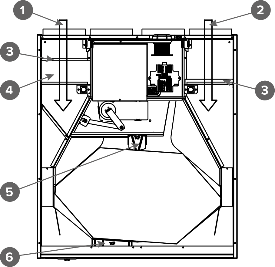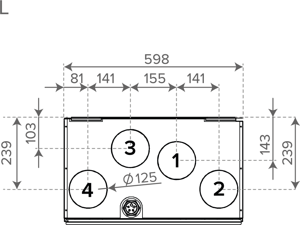 Mitat ja kanavalähdöt Kuva 1. Mitat Vallox 51 MV Kuva 2. Kanavalähdöt, R-malliNaaraslähtökauluksen sisähalkaisija ∅ 125 mm.1Tuloilma koneesta asuntoon2Poistoilma asunnosta koneeseen3Jäteilma koneesta ulos4Ulkoilma koneeseen Kuva 3. Kanavalähdöt, L-malli (vasenkätinen) LTO-kennon tukien paikat Kuva 4. Vallox 51 MV (oikea- ja vasenkätinen malli) 1Tuloilma 2Poistoilma3Karkeasuodatin 4Hienosuodatin5Kennon ylätuki6Kennon alatuki