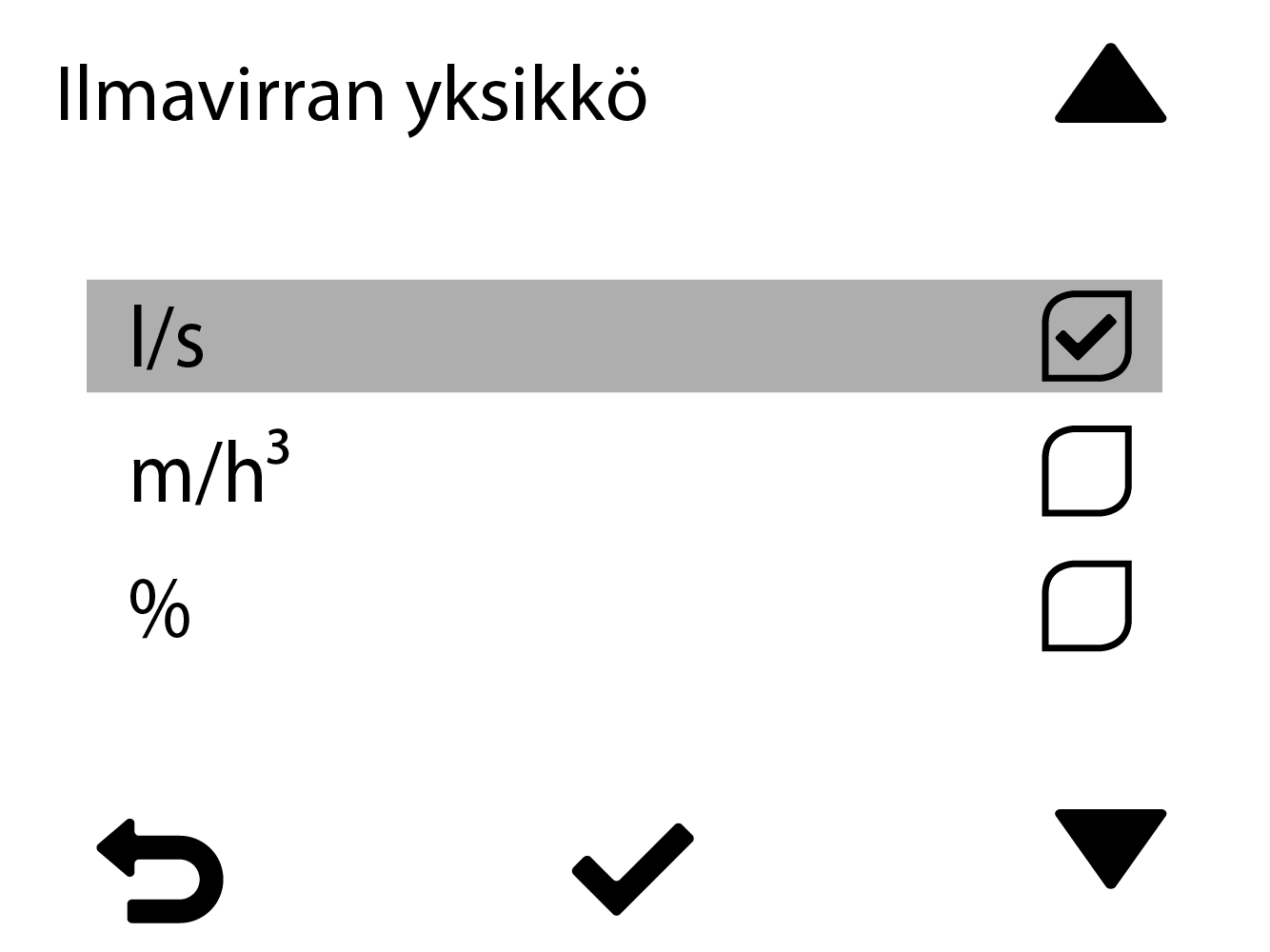 Ilmavirran yksikköValittavat ilmavirran yksiköt ovat: l/s m3/h % Aseta ilmavirran yksikkö. Siirry käyttöönotossa eteenpäin valitsemalla Hyväksy: