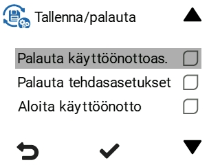 - Palauta käyttöönottoasetukset — Palauttaa käyttöönoton yhteydessä määritetyt asetukset ilmanvaihtokoneeseen.