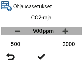 - Valitse hiilidioksidiraja miljoonasosissa (ppm = parts per million = miljoonasosat) Plus- ja Miinus -painikkeilla. Voit asettaa rajan välille 500–2000 ppm. Tehdasasetus on 900 ppm.