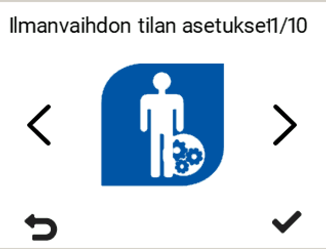 Ilmanvaihdon tilan asetusten muokkaaminen Valitse päävalikossa Ilmanvaihdon tilan asetukset. Valitse haluamasi muokattava tila. Muokkausvalikko avautuu.