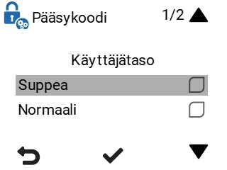 - Normaali — Käyttäjä voi tarkastella ilmanvaihtokoneen tietoja ja tehdä rajoitettuja muutoksia asetuksiin. Pääsy ammattilaisasetuksiin on rajoitettu.