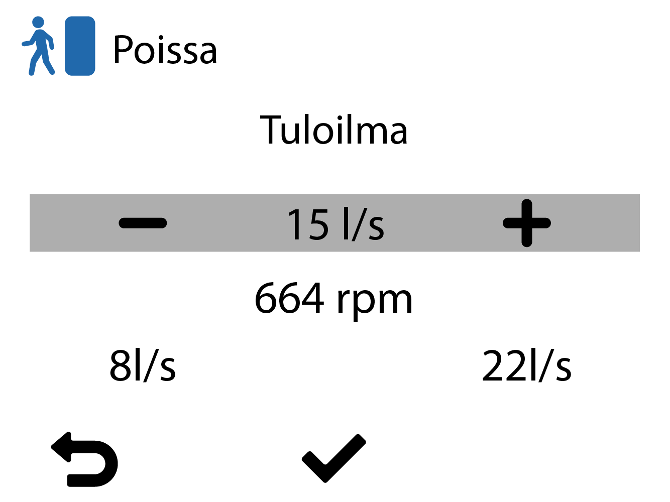 Poissa-tilan ilmavirrat on laskettu automaattisesti 30 % Kotona-tilan ilmavirtoja pienemmiksi, mutta niitä voidaan muuttaa.