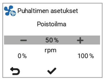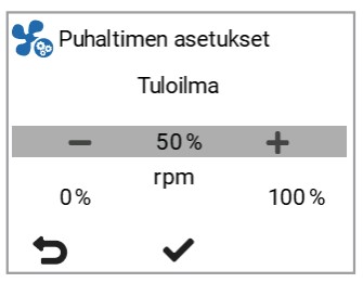 Puhaltimien asetuksetAseta ensin puhaltimien perusasetukset. Näillä asetetaan Kotona-tilan puhallinnopeudet.Säädä venttiilit ja aseta tulo- ja poistoilmapuhaltimille sellaiset ohjausprosentit, joilla Kotona-tilan ilmavirrat toteutuvat.
