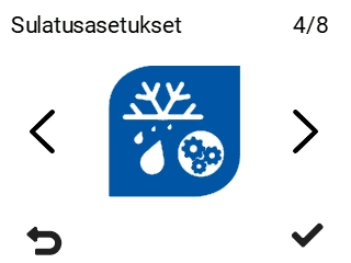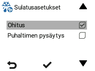 Puhaltimen pysäytys — Tuloilmapuhallin pysäytetään sulatusjakson ajaksi, mikä aiheuttaa hetkellisen alipaineen asuntoon. Tätä asetusta kannattaa käyttää, jos sisäilman lämpötila on poikkeuksellisen matala (<15 °C) tai jos halutaan vähentää lämmitysvastusten käyttöä sulatuksen aikana.