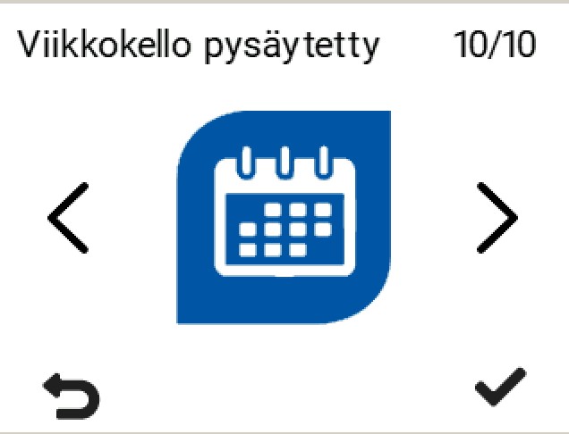 Voit ottaa viikkokellon käyttöön tai poistaa sen käytöstä painamalla muutaman sekunnin ajan Hyväksy-painiketta Viikkokello-näytössä: