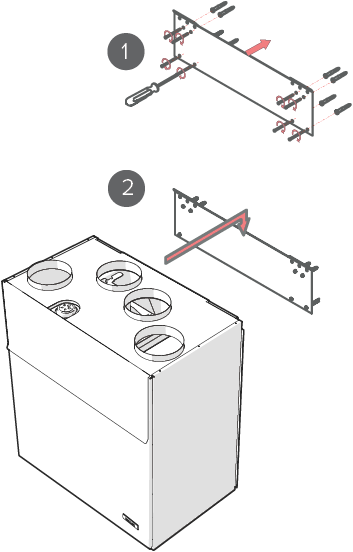 Das Lüftungsgerät sollte wie im Bild gezeigt installiert werden, wenn die Wandmontageplatte verwendet wird. Stellen Sie sicher, dass das Gerät nach der Montage horizontal ausgerichtet ist.