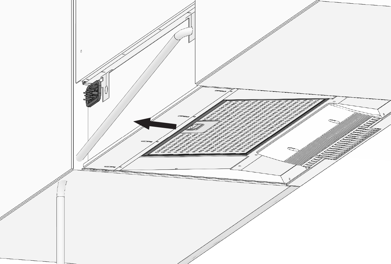Heben Sie die Abzugshaube unter das Lüftungsgerät und stecken Sie die Haken an der Rückseite der Abzugshaube in die Öffnungen am Boden des Lüftungsgeräts. Schieben Sie sie ein.