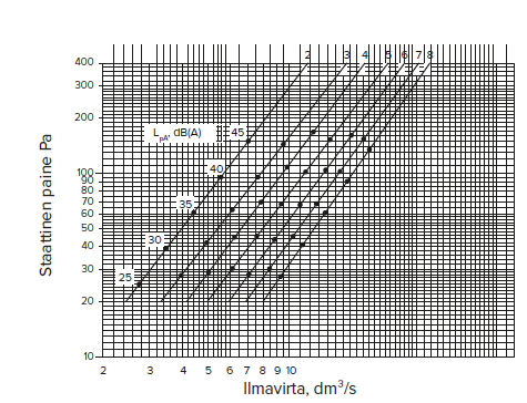 - Der Volumenstrom wird aus dem Leistungsschema ermittelt. Grundlage dafür sind der gemessene Druck und die Anzahl der offenen Löcher in der Klappe.