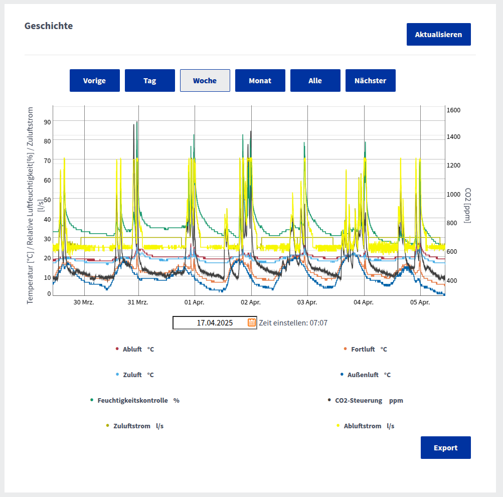 Verwenden Sie die Tasten oberhalb des Diagramms, um den gewünschten Zeitraum zu wählen. In der Home-Benutzeroberfläche werden nur die letzten drei Tage angezeigt, in der Cloud können Sie jedoch längere Zeiträume ansehen.