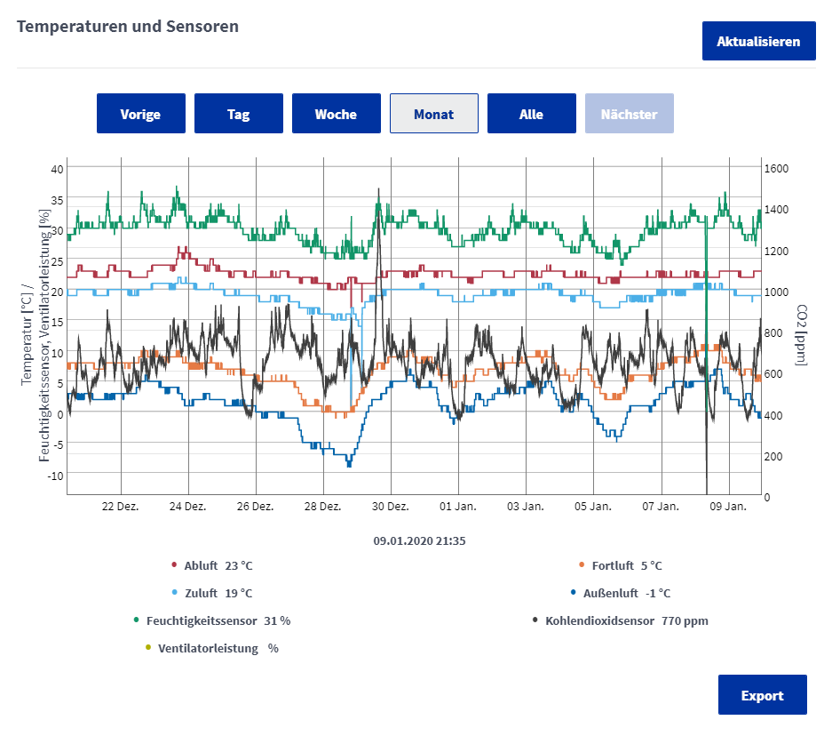 - Wählen Sie Exportieren, um die Statistiken zu speichern.Die Datei wird im Excel-Format gespeichert. Diese Funktion ist nur in der MyVallox Cloud-Benutzeroberfläche verfügbar.