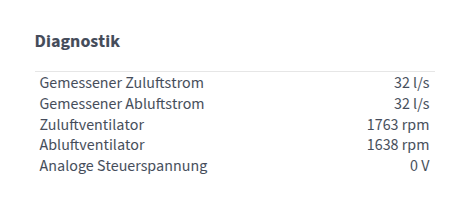 Auf dem Diagnose-Bildschirm können Sie Echtzeitwerte des Lüftungsgeräts überwachen, wie z. B. Luftströme, Ventilatorleistungen und den Status der Digitaleingänge und Relais.