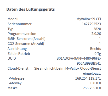 - MyVallox Cloud UUID — Individuelle ID des Lüftungsgeräts im MyVallox Cloud-Dienst.