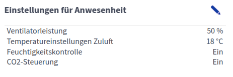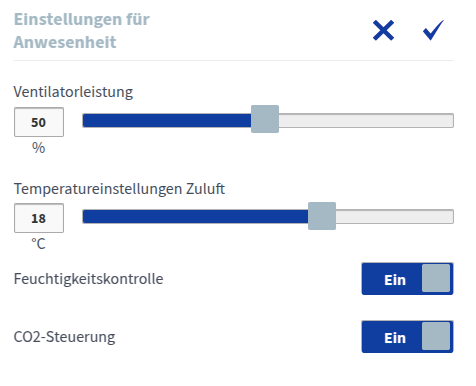 - Ventilatorleistung — Stellen Sie die Lüftungsrate für den Normalbetrieb zwischen 0-100 % ein. Die Ventilatorleistung beeinflusst die Lüftungsrate und damit die Innenraumluftqualität. Die Ventilatorleistung darf nicht niedriger sein als im Abwesend-Modus oder höher als im Stoßlüftung-Modus.