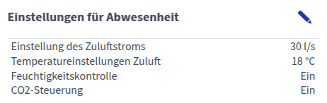- Zuluftstromeinstellungen — Stellen Sie die Lüftungsrate für den Abwesend-Modus ein (l/s oder m³/h). Der Abwesend-Modus ist für Situationen vorgesehen, in denen die Wohnung nicht bewohnt ist und die Lüftung zur Verbesserung der Energieeffizienz verringert werden kann. Der Abwesend-Modus sollte einen geringeren Zuluftstrom haben als der Anwesend-Modus.